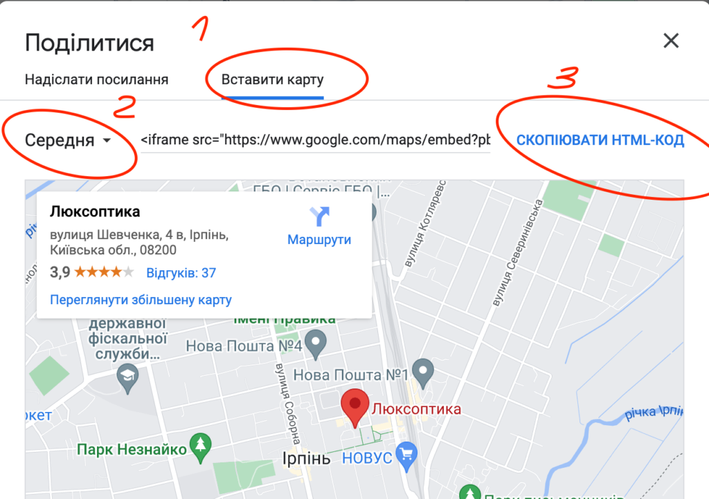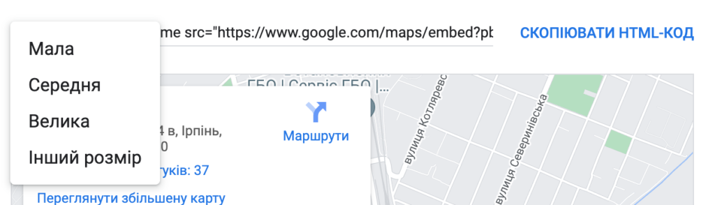 3. Обираємо вставити карту. Потім розмір. І копіюємо HTML код.