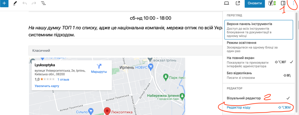 4. Заходимо в статтю/запис, де необхідно вбудувати гугл мапс. У верхньому правому кутку три крапки, візуальний редактор.