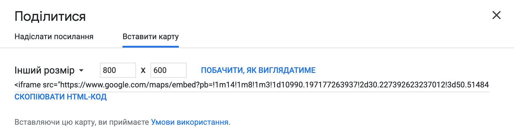 3. Обираємо вставити карту. Потім розмір. І копіюємо HTML код.